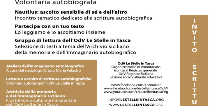 Thrinakìa 8a edizione 2025-2026 Premio internazionale di scritture autobiografiche, biografiche e poetiche, dedicate alla Sicilia – Le Stelle in Tasca ODV-ETS Catania città da leggere Comune di CataniaProgetto realizzato con il finanziamento del Centro per il Libro e la LetturaAtelier a distanza di lettura espressiva emozionale e ascolto sensibile di sé e dell’altro Raccontare una …