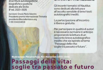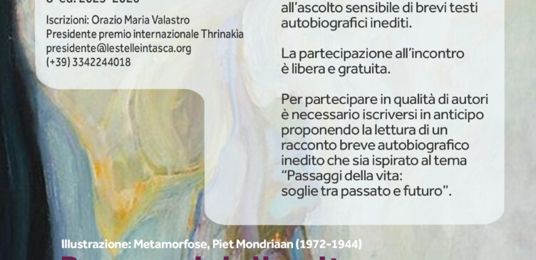 Catania città da leggereComune di Catania | Le Stelle in Tasca ODV-ETSPremio internazionale di scritture autobiografiche biografiche e poetiche dedicate alla Sicilia 8a ed. 2025-2026 Passaggi della vita: soglie tra passato e futuroA cura di Antonella ScolloVolontaria autobiografa Le Stelle in Tasca ODVIncontro dedicato alla lettura e all’ascolto di racconti brevi autobiografici …