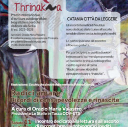 Catania città da leggereComune di Catania | Le Stelle in Tasca ODV-ETSPremio internazionale di scritture autobiografiche biografiche e poetiche dedicate alla Sicilia 8a ed. 2025-2026 Radici amare: ricordi di consapevolezze e rinasciteA cura di Orazio Maria ValastroPresidente Le Stelle in Tasca ODV-ETSIncontro dedicato alla lettura e all’ascolto di racconti brevi autobiografici inediti …