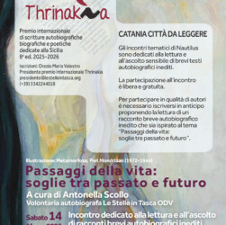 Catania città da leggereComune di Catania | Le Stelle in Tasca ODV-ETSPremio internazionale di scritture autobiografiche biografiche e poetiche dedicate alla Sicilia 8a ed. 2025-2026 Passaggi della vita: soglie tra passato e futuroA cura di Antonella ScolloVolontaria autobiografa Le Stelle in Tasca ODVIncontro dedicato alla lettura e all’ascolto di racconti brevi autobiografici …