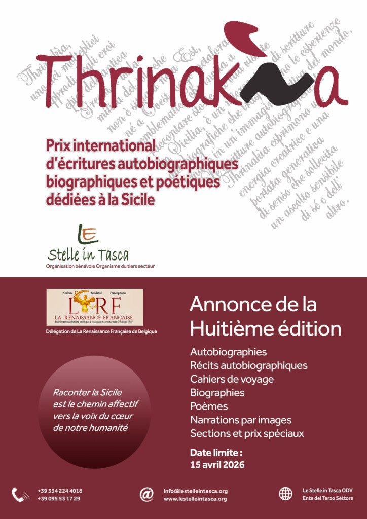 La huitième édition de Thrinakìa, prix international d’écritures autobiographiques, biographiques et poétiques dédiées à la Sicile, est lancée. Le prix, conçu et réalisé par l’organisation bénévole Les Étoiles dans la poche – Organisme du tiers secteur, a été créé en 2012 dans le cadre du projet d’animation sociale et culturelle des Ateliers de l’imaginaire autobiographique. Les Étoiles dans la poche, organisation inscrite au Registre national du tiers secteur (RUNTS : répertoire 61139), propose depuis 2005 des ateliers de narration, de lecture et d’écriture autobiographique, en privilégiant une pédagogie de la mémoire et de l’imaginaire, une éthique de la réciprocité et une écoute sensible de soi et des autres. Les autobiographies recueillies au fil du temps sont devenues un patrimoine culturel immatériel conservé par les Archives de la mémoire et de l’imaginaire sicilien, rattachées au réseau européen des archives autobiographiques de l’EDAC – European Ego-Documents Archives and Collections Network.